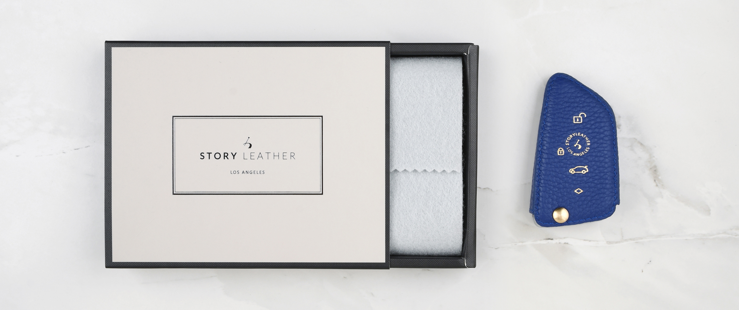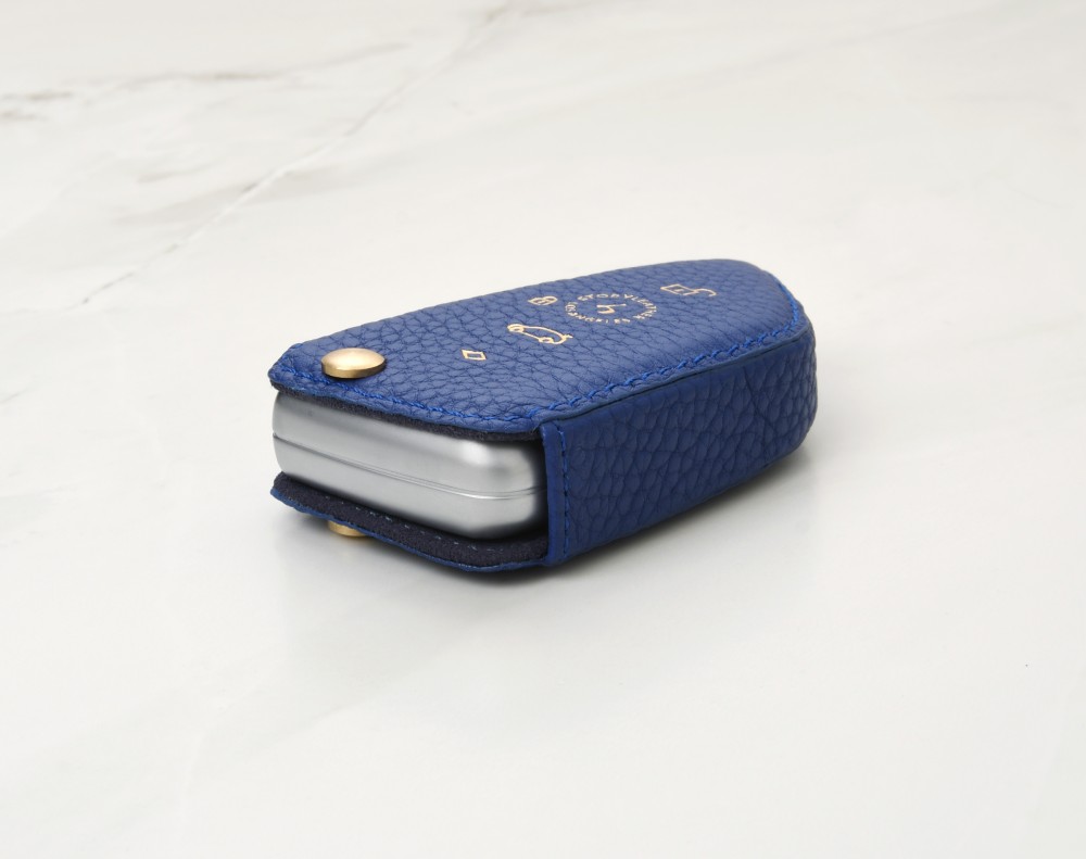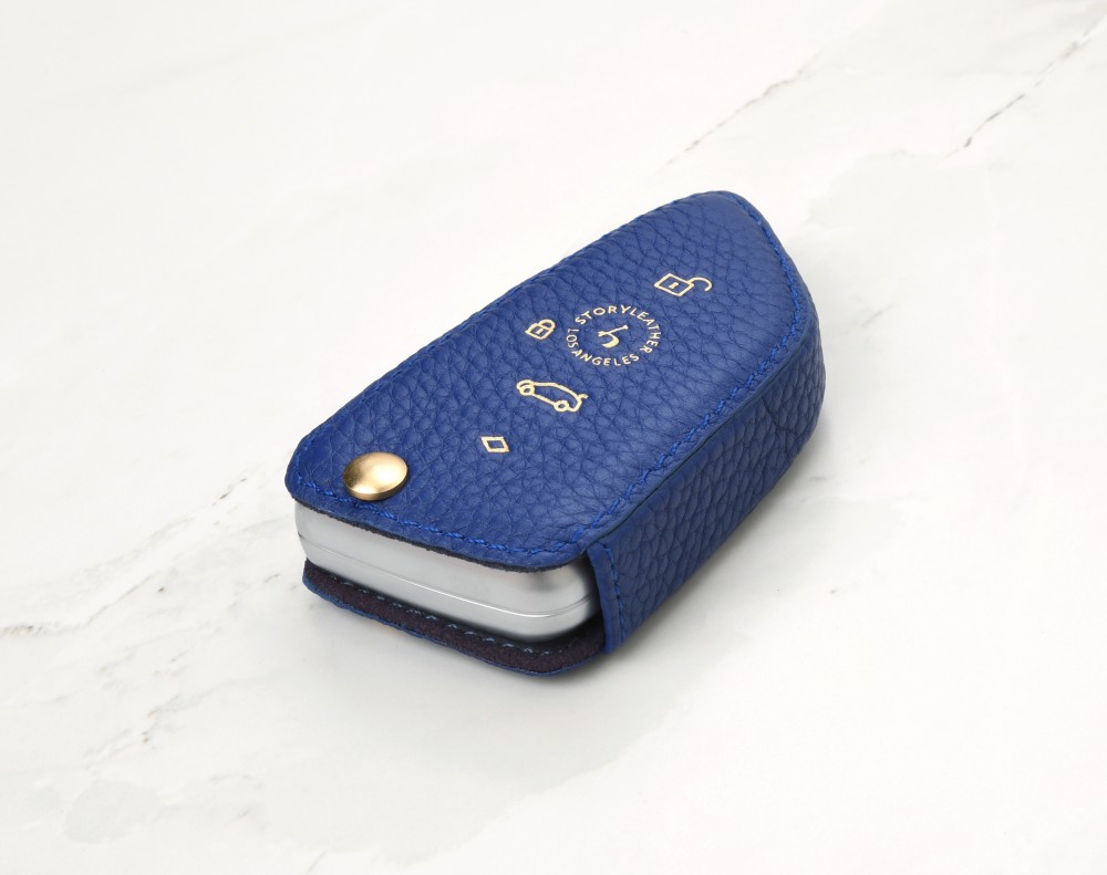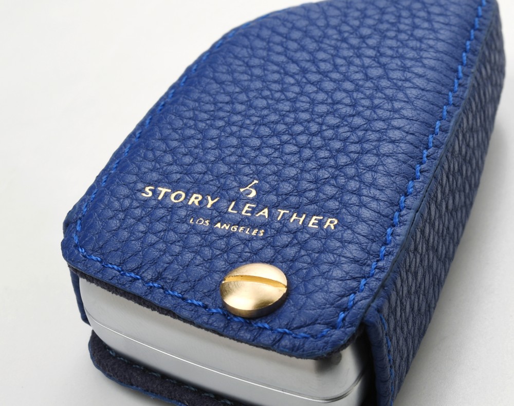Blue keychain buckle, used with the leather case itself.