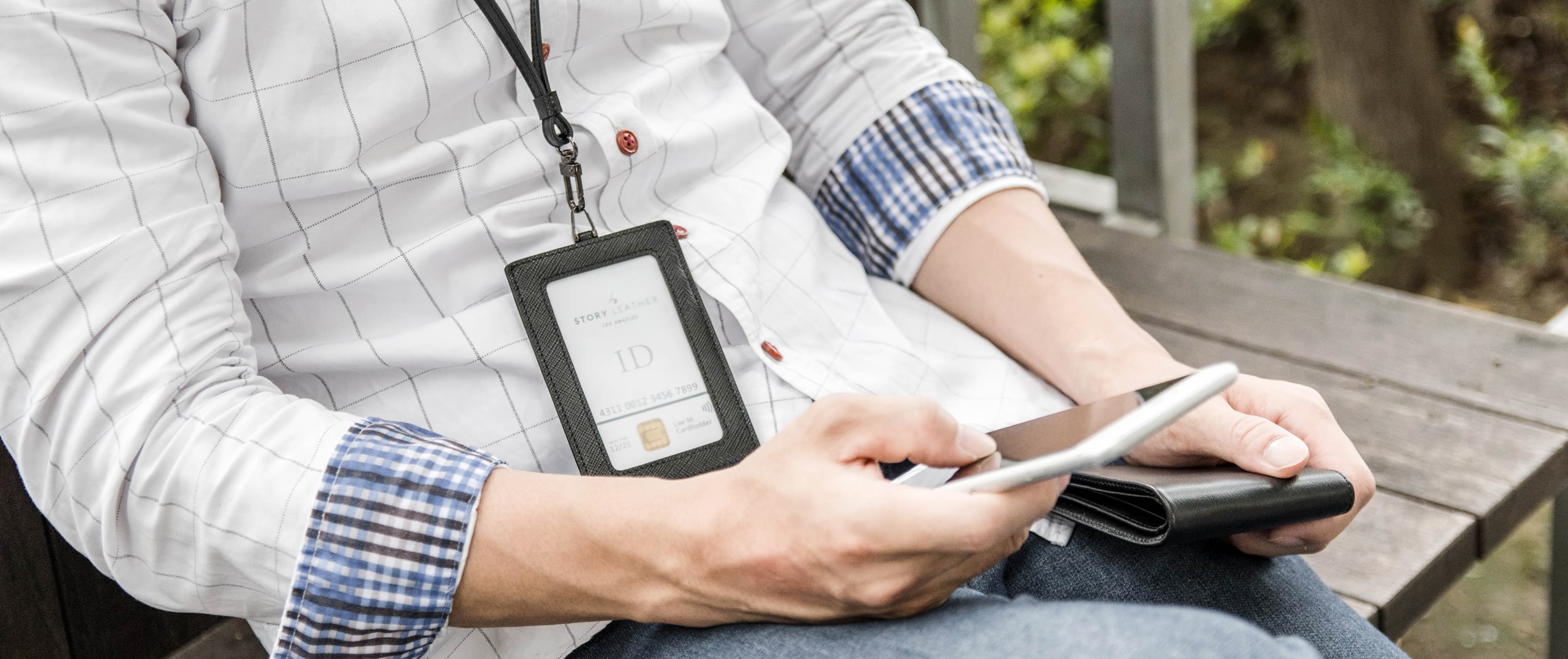 - Handmade black saffiano leather ID card lanyard