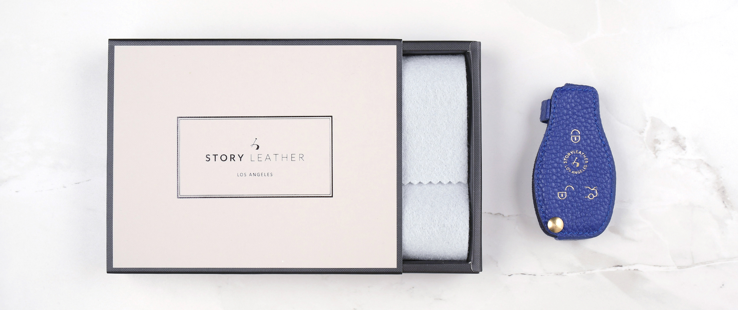 Blue keychain buckle, used with the leather case itself.