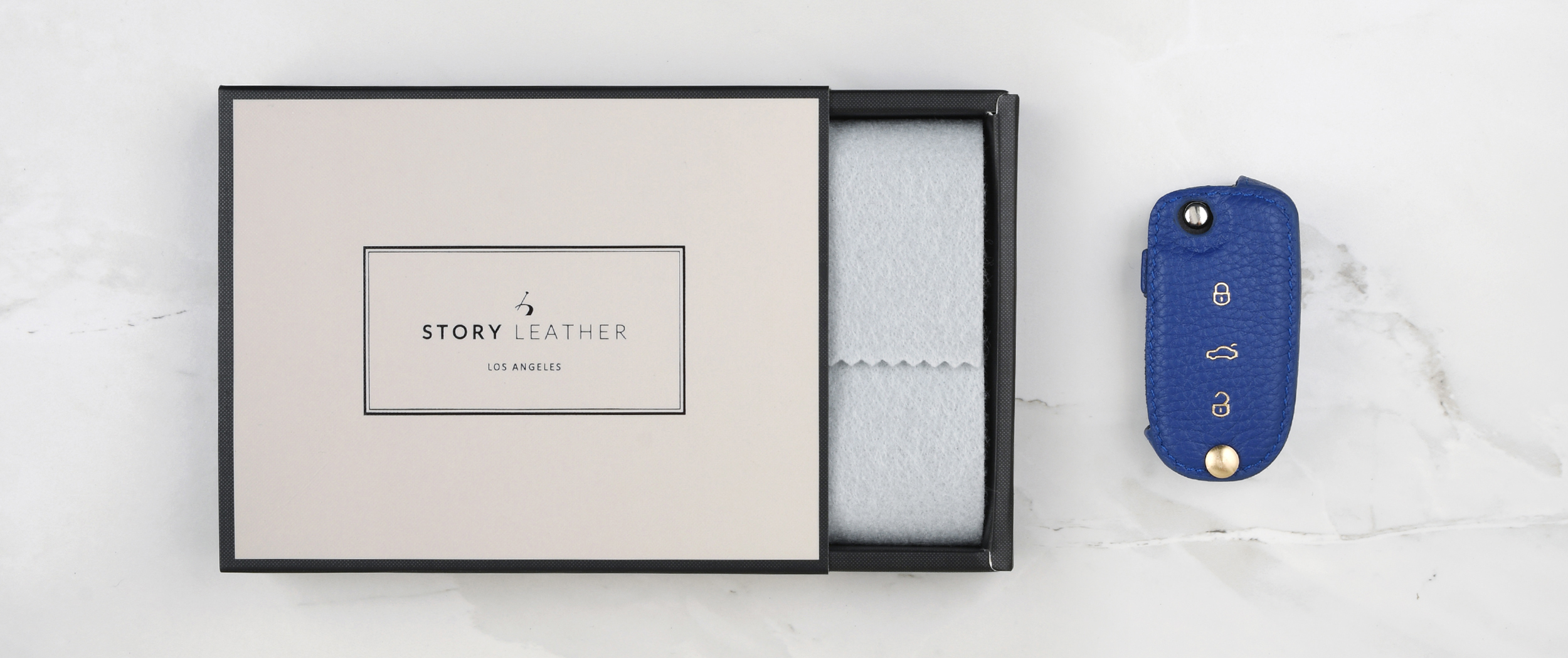 Blue keychain buckle, used with the leather case itself.