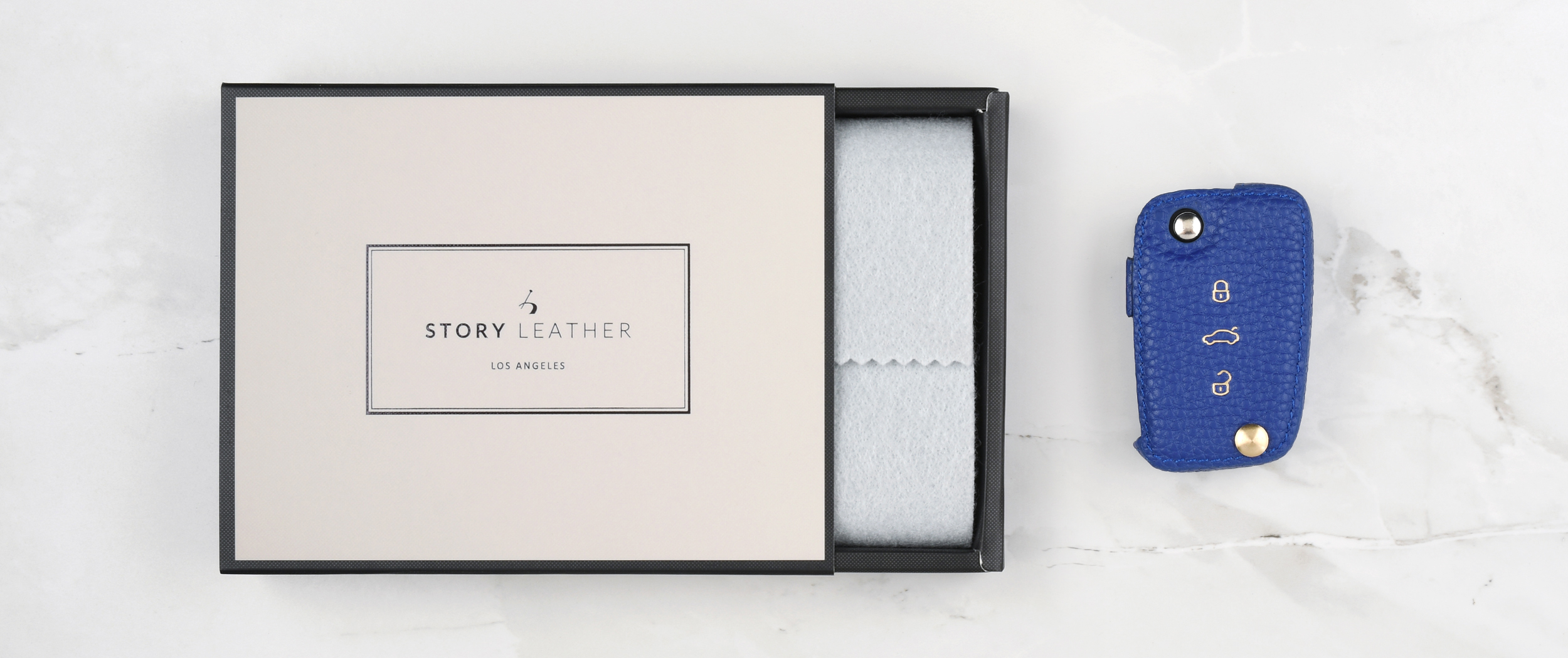 Blue keychain buckle, used with the leather case itself.